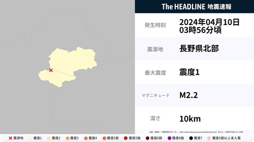 4月10日3時56分頃、長野県で最大震度1の地震を観測