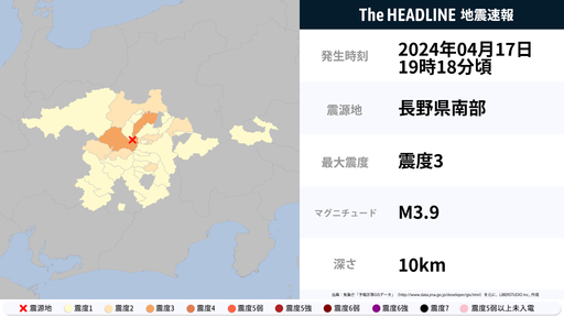 4月17日19時18分頃、長野県で最大震度3の地震を観測