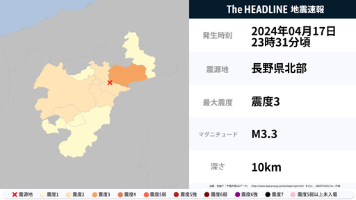 4月17日23時31分頃、長野県で最大震度3の地震を観測
