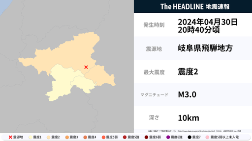 4月30日20時40分頃、長野県・岐阜県で最大震度2の地震を観測