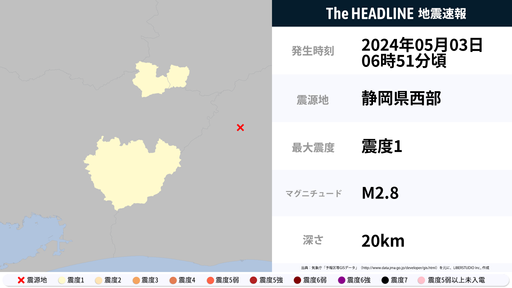 5月3日6時51分頃、長野県・静岡県などで最大震度1の地震を観測