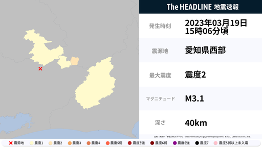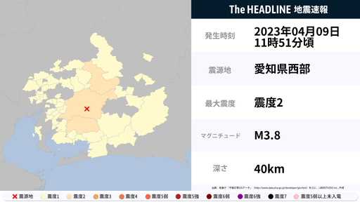 4月9日11時51分頃、岐阜県・愛知県で最大震度2の地震を観測