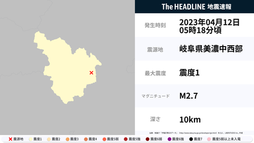 4月12日5時18分頃、岐阜県で最大震度1の地震を観測