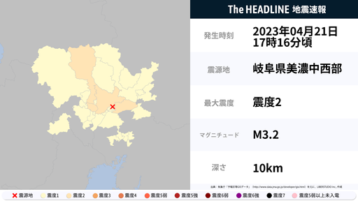 4月21日17時16分頃、岐阜県で最大震度2の地震を観測