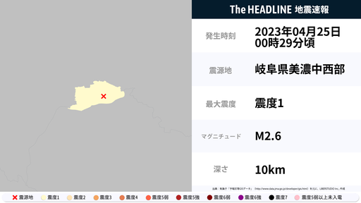 4月25日0時29分頃、岐阜県で最大震度1の地震を観測