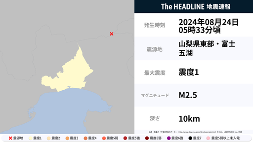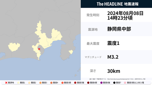 8月24日5時33分頃、静岡県で最大震度1の地震を観測