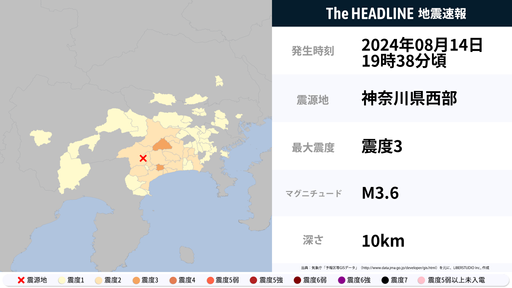8月14日19時38分頃、神奈川県で最大震度3の地震を観測