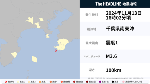 11月13日16時2分頃、千葉県・東京都などで最大震度1の地震を観測