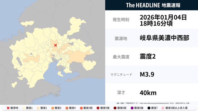 基本情報発生時刻1月4日18時16分震源地岐阜県美濃中西部最大震度2マグニチュード3.9深さ 40km北緯35.4度 東経136.8度