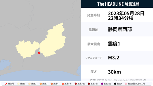 5月28日22時35分頃、静岡県・愛知県で最大震度1の地震を観測
