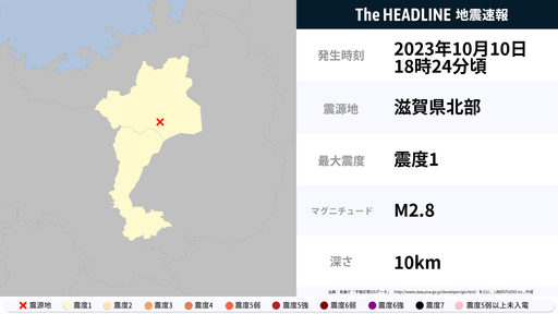 10月10日18時24分頃、滋賀県で最大震度1の地震を観測