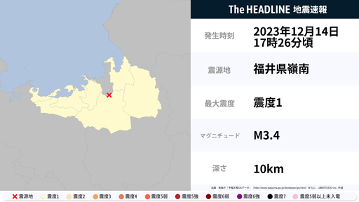 12月14日17時26分頃、福井県・滋賀県で最大震度1の地震を観測