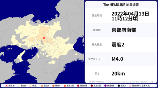 4月13日11時12分頃、京都府などで最大震度2を観測する地震がありました。