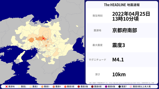 4月25日13時10分頃、京都府などで最大震度3を観測する地震がありました。