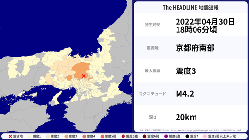 4月30日18時06分頃、京都府などで最大震度3を観測する地震がありました。