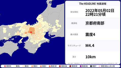 5月2日22時21分頃、京都府で最大震度4を観測する地震がありました。