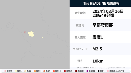 3月16日23時49分頃、京都府で最大震度1の地震を観測