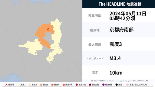 5月11日5時43分頃、京都府で最大震度3の地震を観測