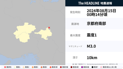 8月15日0時14分頃、京都府・兵庫県で最大震度1の地震を観測