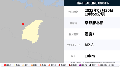 8月30日19時59分頃、京都府で最大震度1の地震を観測