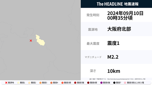 9月10日0時35分頃、大阪府で最大震度1の地震を観測