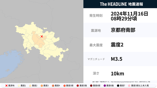 11月16日8時29分頃、京都府・大阪府で最大震度2の地震を観測
