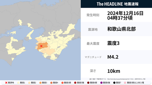 12月16日4時37分頃、和歌山県で最大震度3の地震を観測