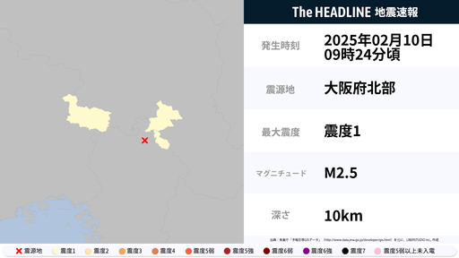 2月10日9時24分頃、京都府・大阪府で最大震度1の地震を観測