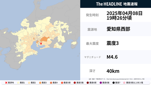 4月8日19時26分頃、愛知県で最大震度3の地震を観測