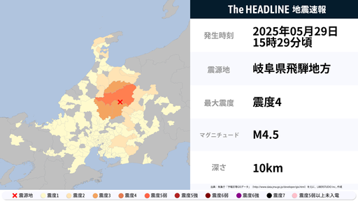 5月29日15時29分頃、岐阜県で最大震度4の地震を観測