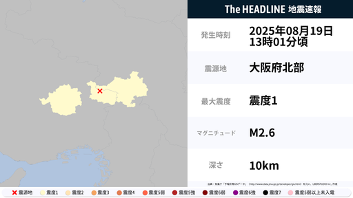 8月19日13時1分頃、京都府・大阪府などで最大震度1の地震を観測