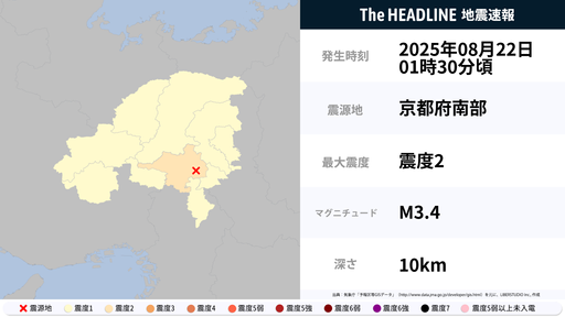 8月22日1時30分頃、京都府で最大震度2の地震を観測