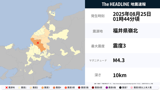 08月25日01時44分頃、福井県嶺北を震源とするマグニチュード4.3の地震が観測された。最大震度3を観測したのは、福井県・岐阜県。