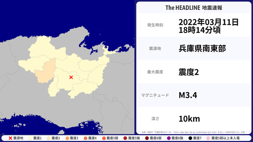 3月11日18時14分頃、兵庫県で最大震度2を観測する地震がありました。
