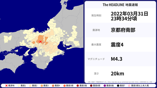 3月31日23時34分頃、京都府で最大震度4を観測する地震がありました。