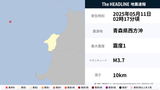 5月11日2時17分頃、青森県で最大震度1の地震を観測
