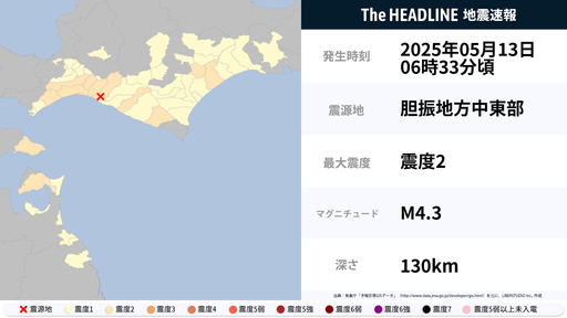 5月13日6時33分頃、北海道・青森県で最大震度2の地震を観測