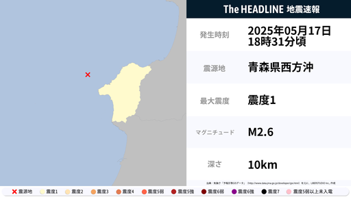 5月17日18時31分頃、青森県で最大震度1の地震を観測