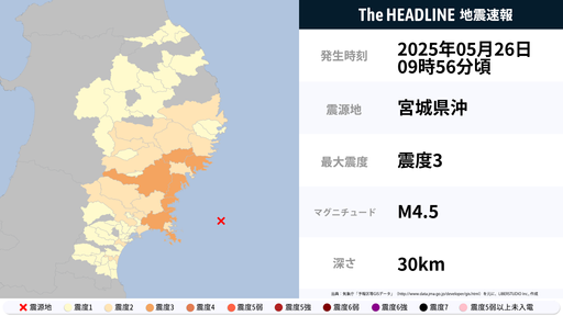 5月26日9時56分頃、岩手県・宮城県で最大震度3の地震を観測