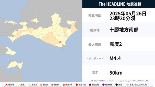 5月26日23時30分頃、北海道で最大震度2の地震を観測