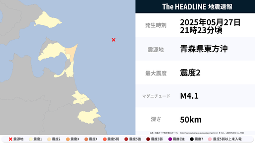 5月27日21時23分頃、青森県で最大震度2の地震を観測