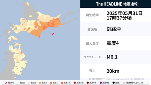 5月31日17時37分頃、北海道で最大震度4の地震を観測