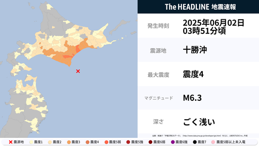 6月2日3時52分頃、北海道で最大震度4の地震を観測
