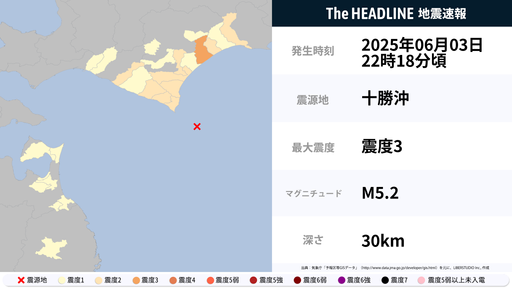 6月3日22時18分頃、北海道で最大震度3の地震を観測