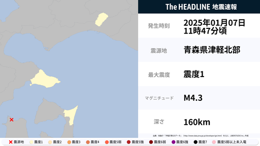 1月7日11時47分頃、北海道・青森県で最大震度1の地震を観測