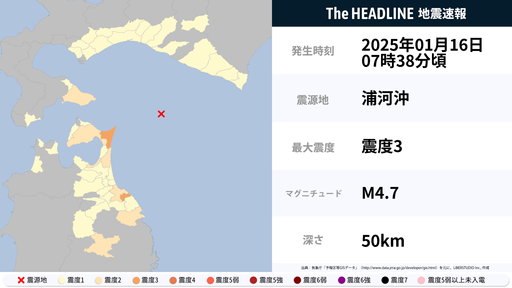 1月16日7時38分頃、青森県で最大震度3の地震を観測