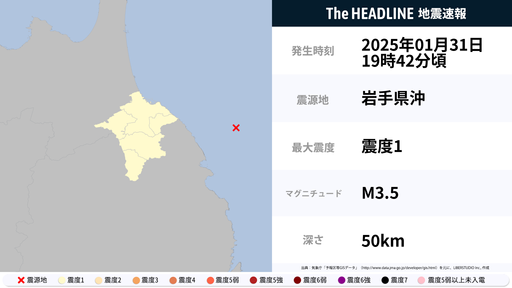 1月31日19時42分頃、青森県・岩手県で最大震度1の地震を観測