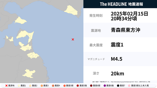 2月15日20時34分頃、北海道・青森県などで最大震度1の地震を観測