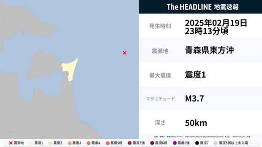 2月19日23時13分頃、青森県で最大震度1の地震を観測