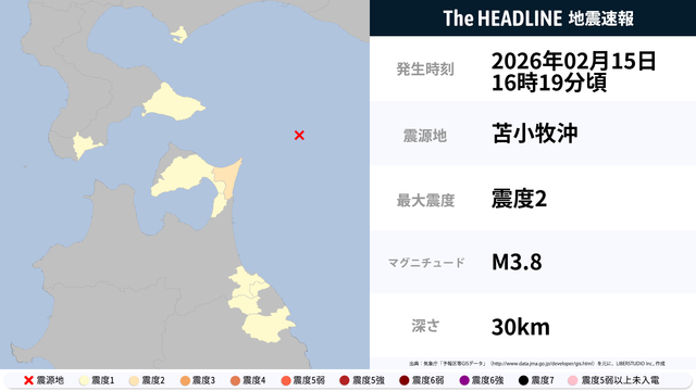 2月15日16時19分頃、苫小牧沖を震源とするマグニチュード3.8の地震が観測された。最大震度2を観測したのは、青森県。